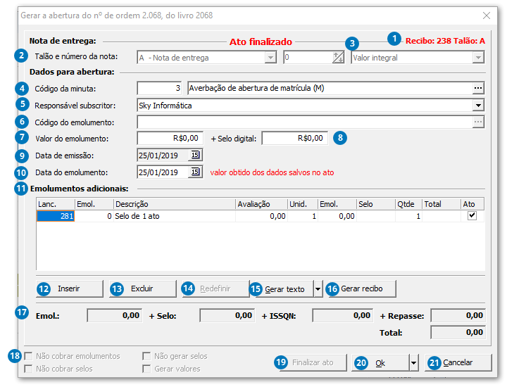 Lista dos emolumentos adicionais. Algumas informações podem ser realizadas diretamente dando foco no campo desejado.