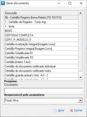 Feche a tela de emolumentos pra continuar. Será exibida a tela de seleção de minutas, com todos os modelos disponíveis apra as certidões positivas.