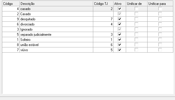 Utilizado para fazer busca por estado civil. No campo tipo, selecione a opção desejada para busca. A opção "Ativo" é utilizada para exibir ou não os dados que estão ativos.