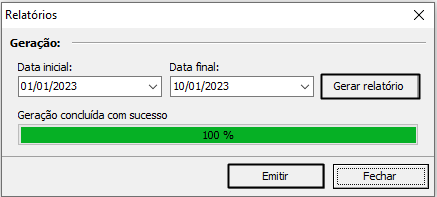 Para gerar um relatório deve-se clicar em “Gerar novo”, após informar uma data inicial e final e clicar no botão “Gerar relatório”. Ao finalizar a geração, clique no botão “Emitir” que ficará habilitado.