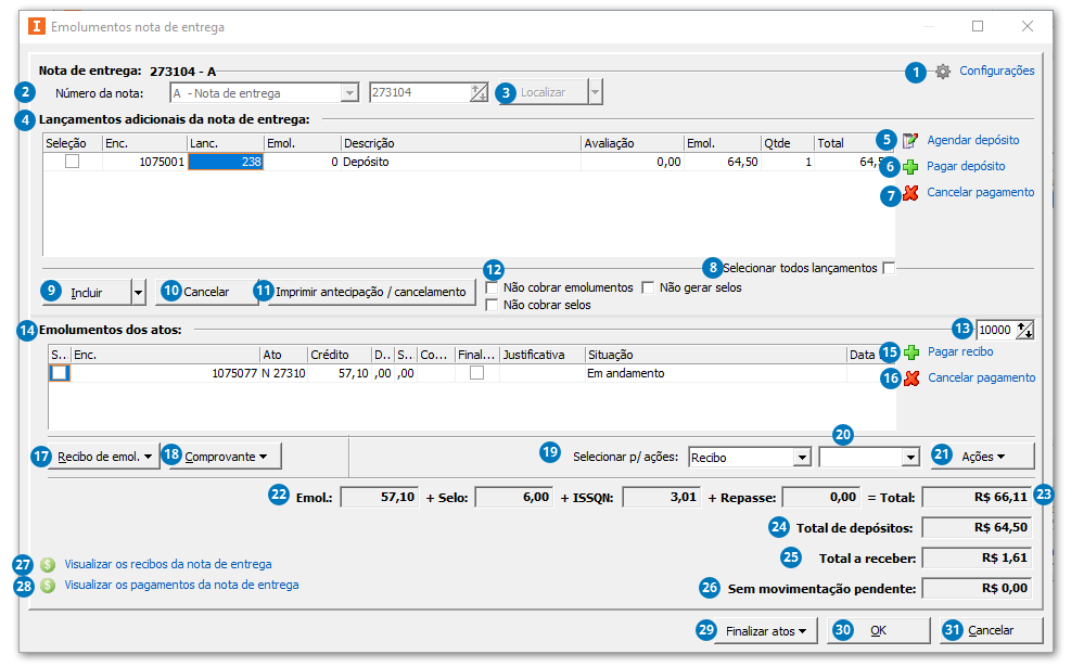 Cancelar emolumento: Utilizado para cancelar os emolumentos. Só é possível cancelar o emolumento caso não exista recibo.