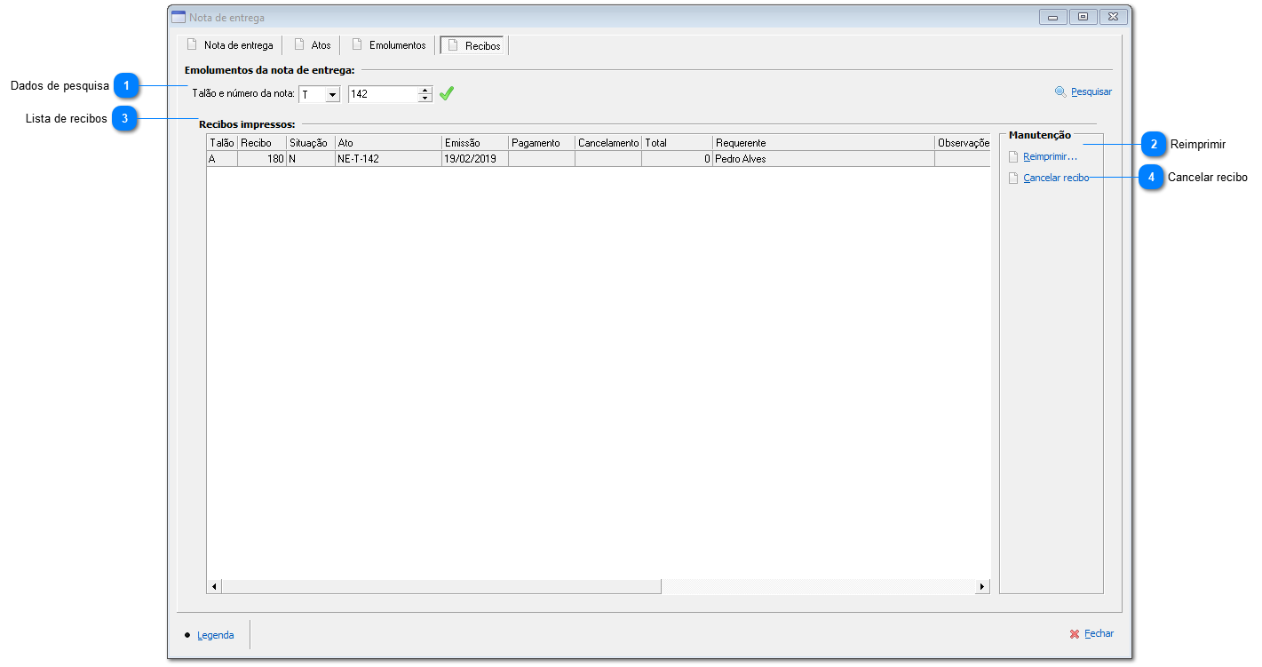 Informação da nota de entrega procurada. Quando acessado pela aba nota de entrega, traz a nota selecionada no grid, mas pode ser acessado direto pela tela de atos e navegar entre as notas.